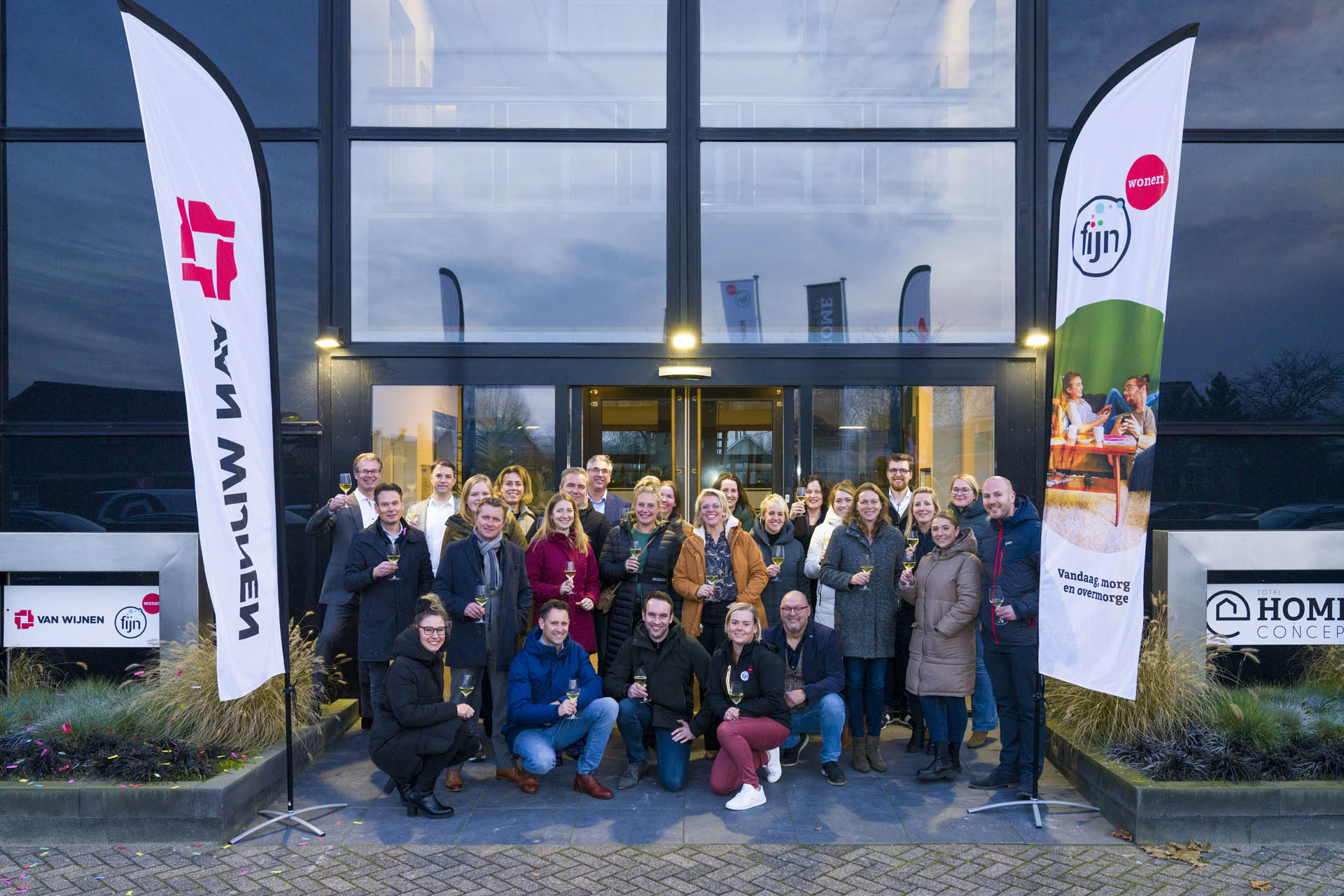 In het pand van Total Home Concept aan de Schoepenweg werden diverse ruimtes gestript en gerenoveerd tot een moderne showroom. Op dinsdag 13 december werd de showroom, na een feestelijke opening officieel in gebruik genomen. Vanaf nu wordt de ruimte door zowel kopersbegeleiders van Van Wijnen als Fijn Wonen-coaches van Fijn Wonen gebruikt om kopers te ondersteunen in de keuzes rondom de afwerking én oplevering van hun nieuwbouwwoning. Toineke Overmars, manager kopersbegeleiding bij Van Wijnen vertelt:“Bij het kopen van een nieuwbouwwoning komt er veel op je af. Er moet in korte tijd van alles geregeld worden en ondertussen ga je kiezen hoe je wilt wonen. Dan is het fijn om een vast aanspreekpunt te hebben om al je woonwensen mee te bespreken.”